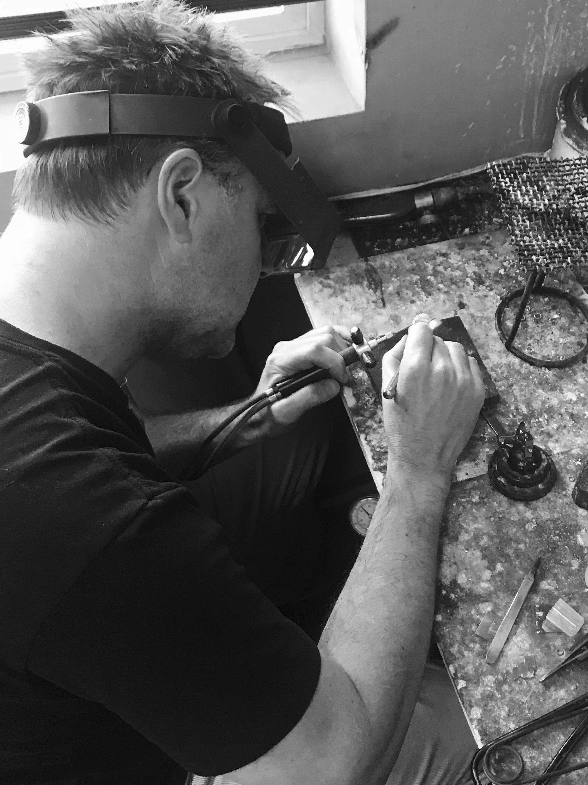 Andy Bugher began his career in jewelry while studying Fine Art at the University of Wisconsin, Stout campus. It was there that he made his first piece of jewelry, and he was immediately hooked. He loved the processes involved in working in metal: casting, forging, creating a piece with hammers, torches, and his bare hands.